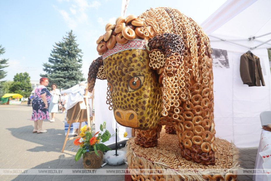 Здесь вас ждут красочная фотозона с зубром, увешенным баранками, хлебные диарамы, которые сложно отличить от настоящих предметов, яркие караваи, пироги. Ярким украшением стал огромный каравай, посвященный главной теме праздника. На нем разместились знаковые места, памятники и музеи в честь Великой Победы.