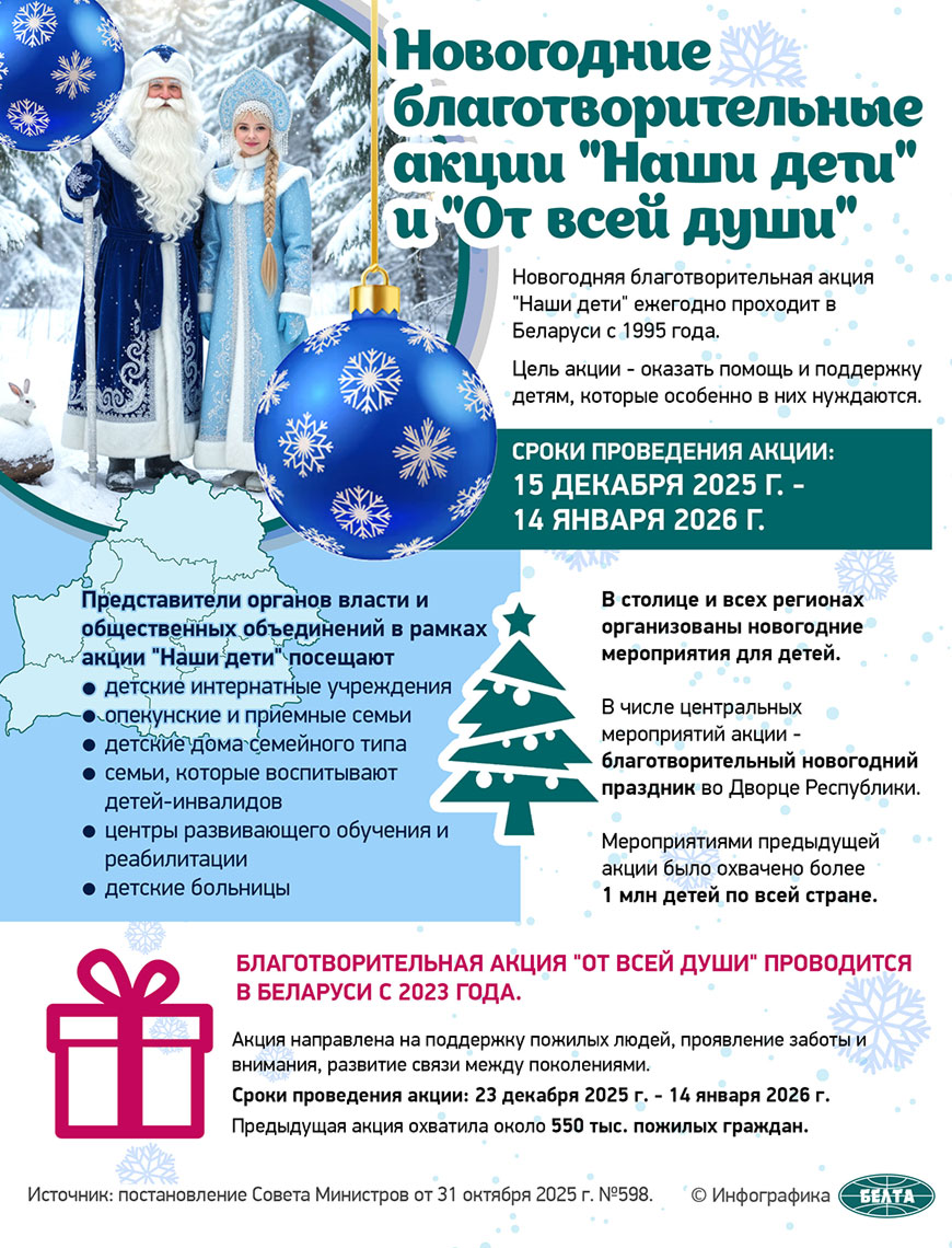 Центральным событием акции «Наши дети» является главная елка страны — благотворительный новогодний праздник с участием Президента и показом новогоднего представления во Дворце Республики. В этом году для детей приготовили яркое представление «Волшебство Нового года» со сказочными персонажами и главными атрибутами зимних праздников.